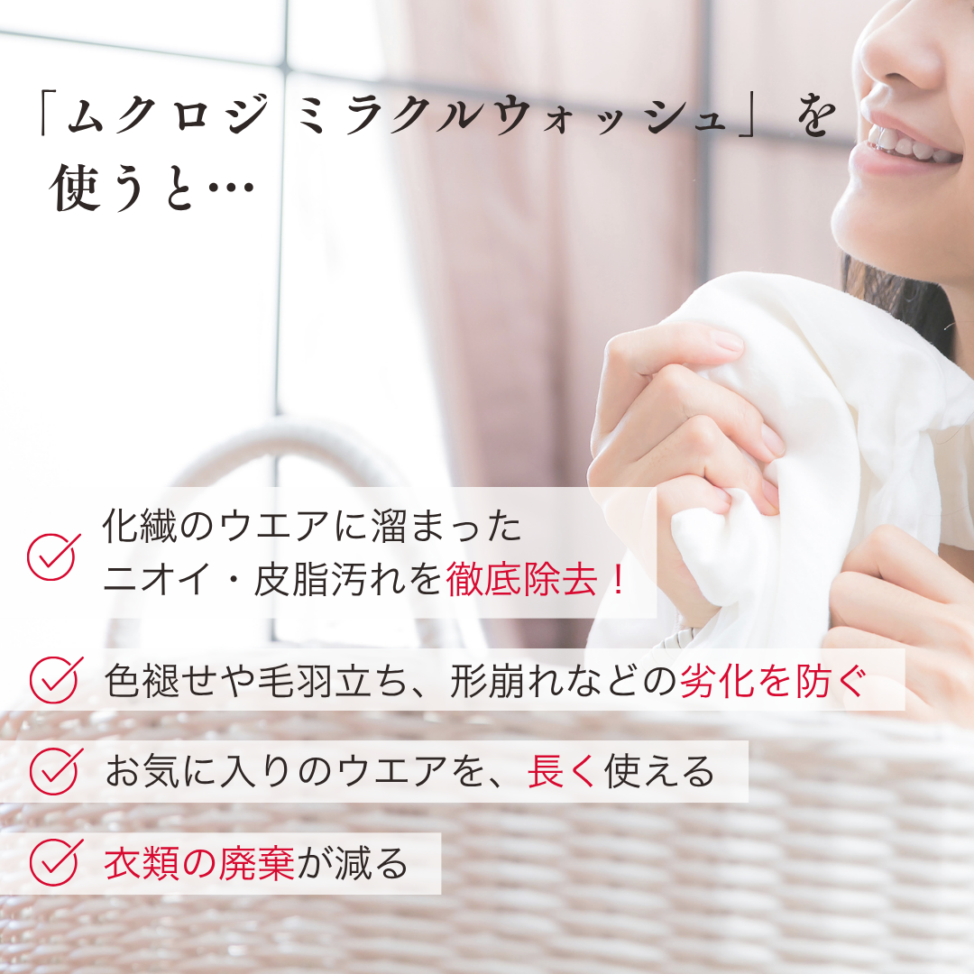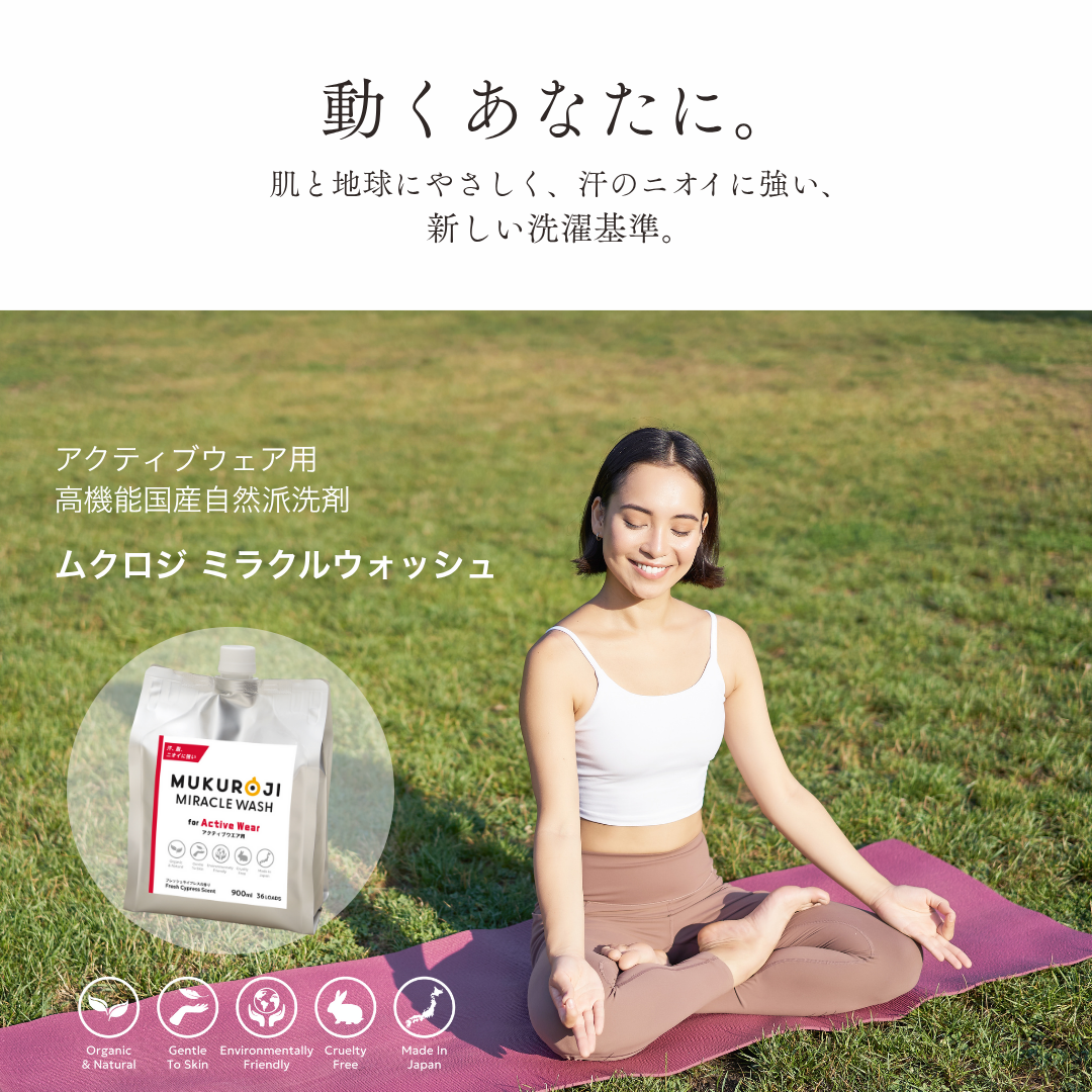 ムクロジ ミラクルウォッシュは、汗や皮脂のニオイに着目して開発された国産の高機能自然派洗濯洗剤です。ジムウェアやヨガウェアなどのアクティブウェアや、綿・麻・混紡の普段着、吸汗速乾インナー、ナイトブラ、枕カバーなどをすっきり清潔に洗い上げます。化繊素材のニオイ戻りやゴワつきにも。