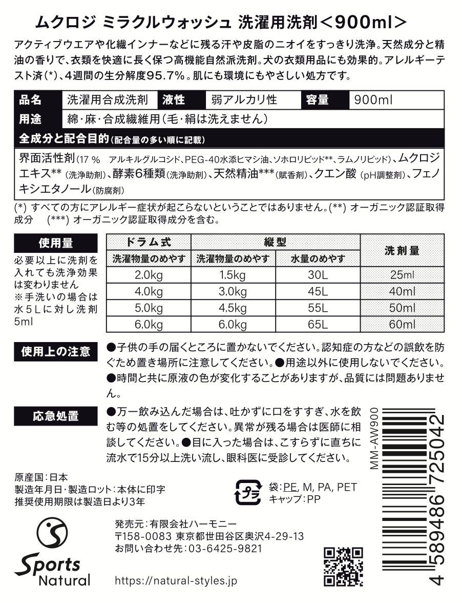 化学繊維で出来たアクティブウエアや衣類に蓄積しがちな汗・脂のニオイ除去に着目した国産高機能自然派洗剤です。昭和初期頃までは洗濯に使われていたムクロジ(無患子)という天然の木の実の抽出エキスを主成分に、ヨーロッパ最先端の環境成分を加えて作った、人にも環境にも優しい洗濯洗剤です。