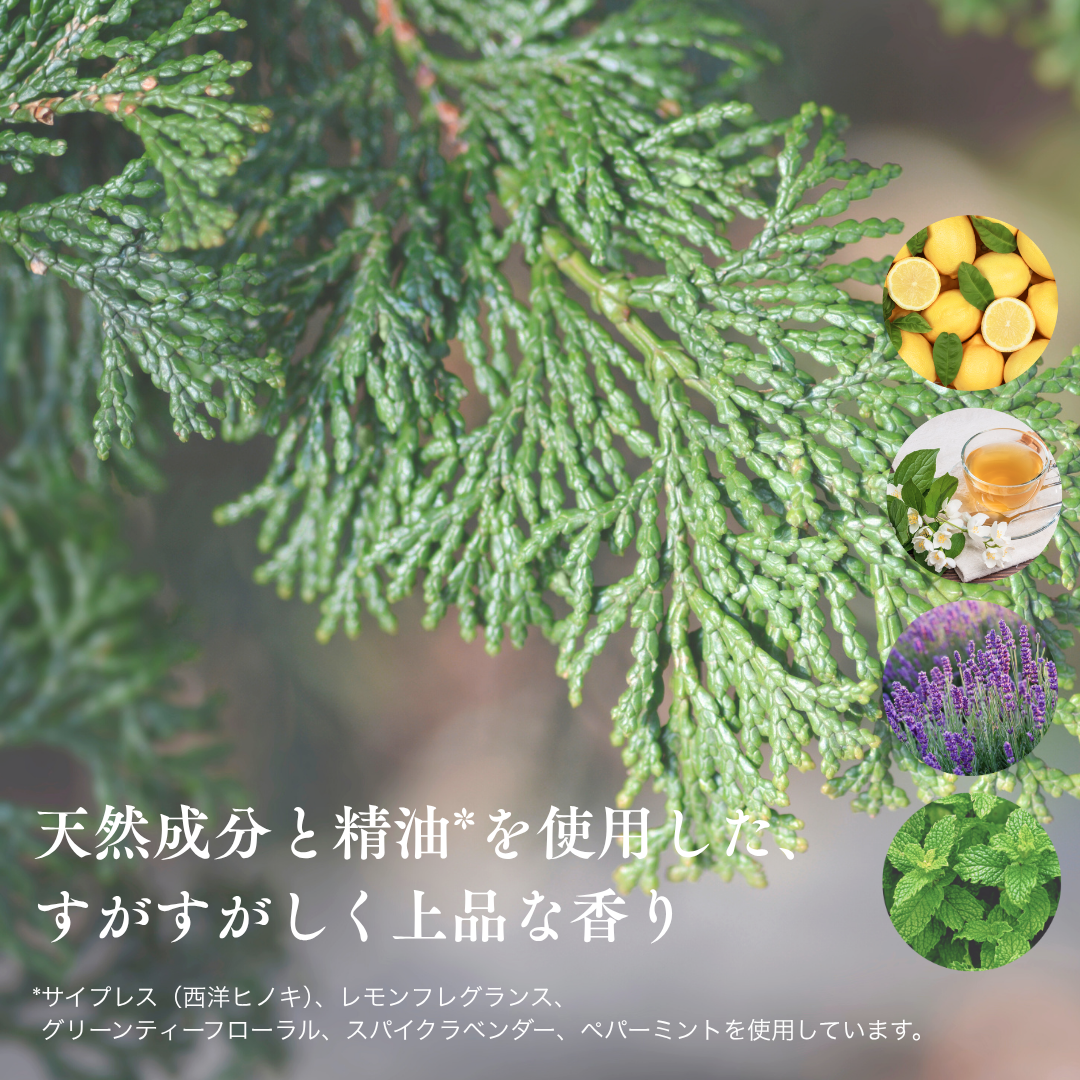 合成香料は一切不使用。抗菌作用のあるサイプレス(西洋ヒノキ)を中心にブレンド。著名調香師による、森林浴を思わせるような上質で心地よい香りは洗濯中だけふんわり香り、乾くころにはほとんど残りません。