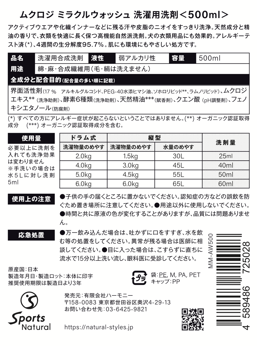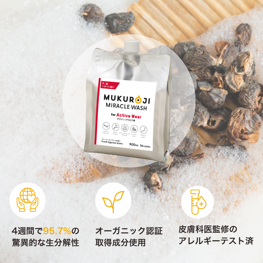 ムクロジ ミラクルウォッシュは、汗や皮脂のニオイに着目して開発された国産の高機能自然派洗濯洗剤です。ジムウェアやヨガウェアなどのアクティブウェアや、綿・麻・混紡の普段着、吸汗速乾インナー、ナイトブラ、枕カバーなどをすっきり清潔に洗い上げます。化繊素材のニオイ戻りやゴワつきにも。