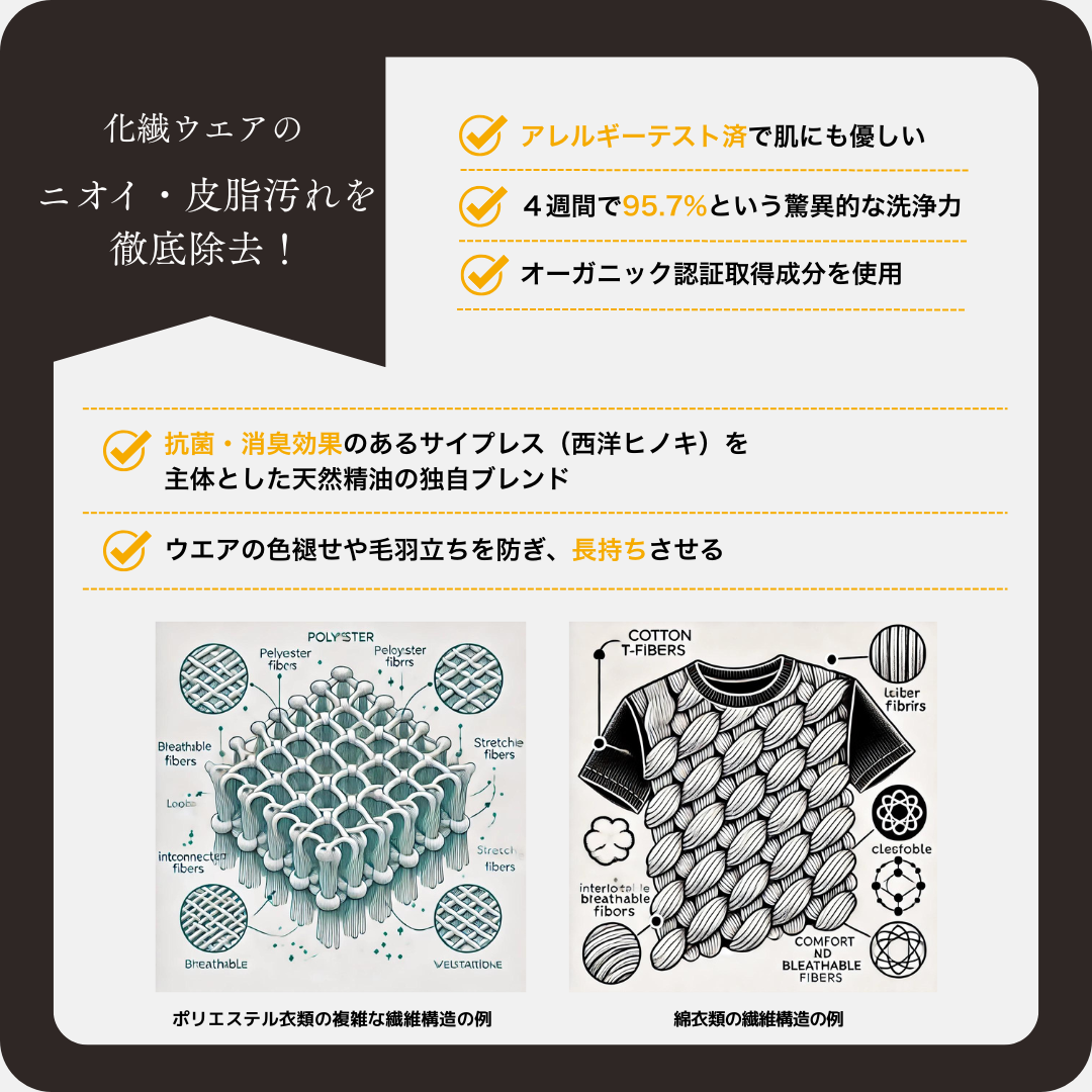 しかし化学繊維は構造上、汗や皮脂汚れが蓄積しやすく、洗濯後もニオイが残ることが課題でした。その結果、好きな衣類でも捨てるしかないことに。
