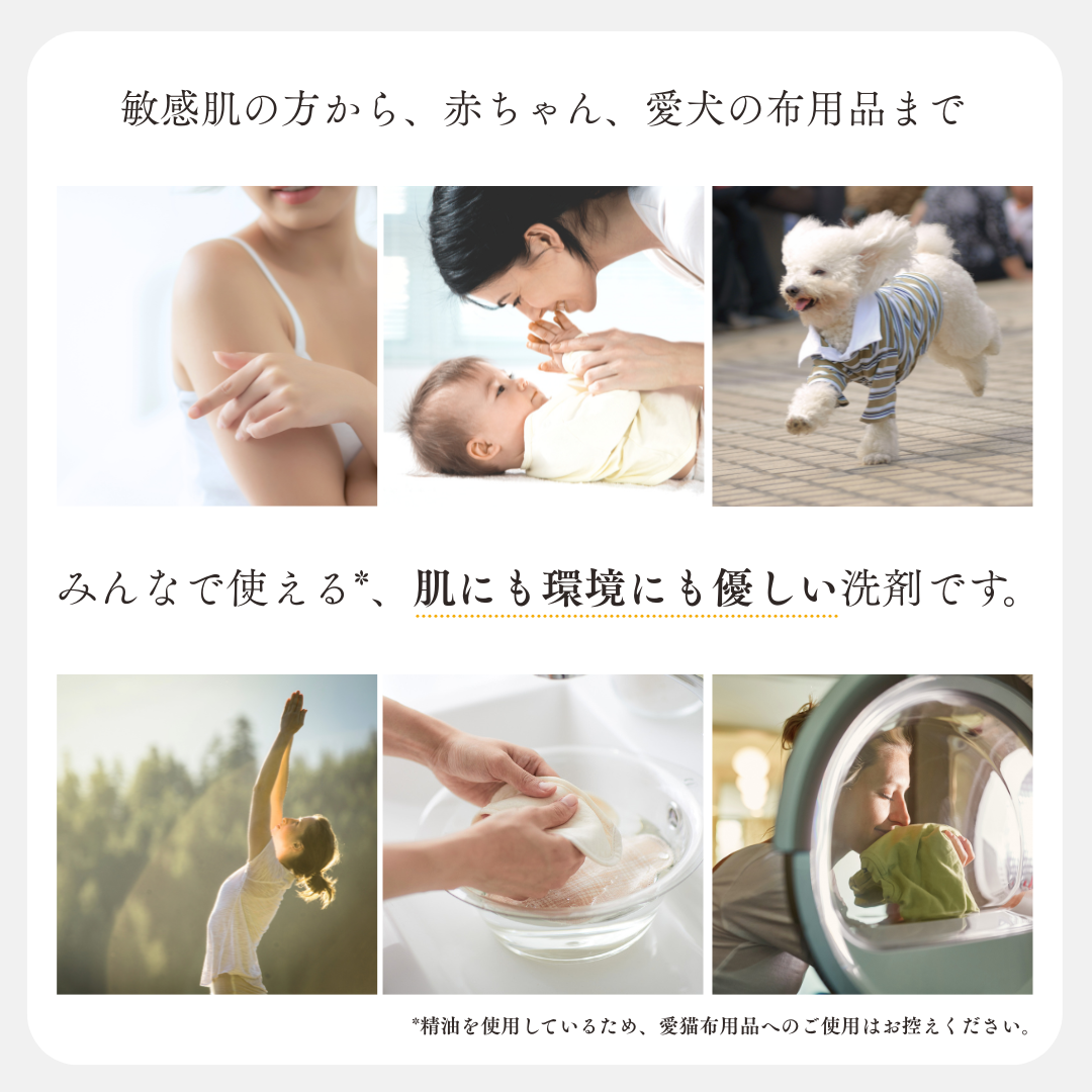 合成香料・漂白剤・蛍光増白剤・着色料フリー。皮膚科医監修のアレルギーテスト済※1で、敏感肌の方や赤ちゃん、愛犬の衣類やマットなどにもお使いいただけます(※精油を使用しているため愛猫用布製品への使用はお控えください)。手洗いのお洗濯にも!
